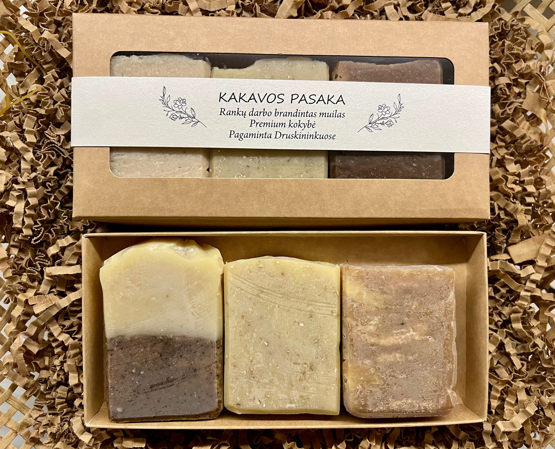 Šis muilų rinkinys puikiai tiks vertinantiems natūralią, jaukią ir veiksmingą odos priežiūrą. Kavos muilas švelniai šveičia ir tonizuoja odą, avižų, medaus, bei kokosų pieno muilelis ramina, maitina bei minkština, o kakavos muilas su levandų eteriniu aliejumi drėkina, atpalaiduoja ir suteikia komforto pojūtį – idealus pasirinkimas kasdieniam naudojimui ir dovanai.