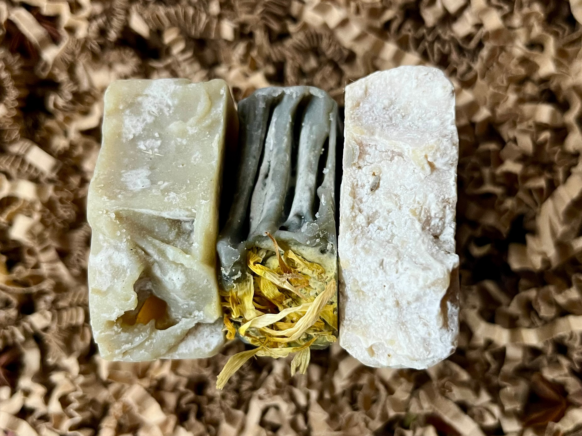 Pilkojo molio muilas kvepintas apelsinų eteriniu aliejumi, bei puoštas medetkų žiedais.
